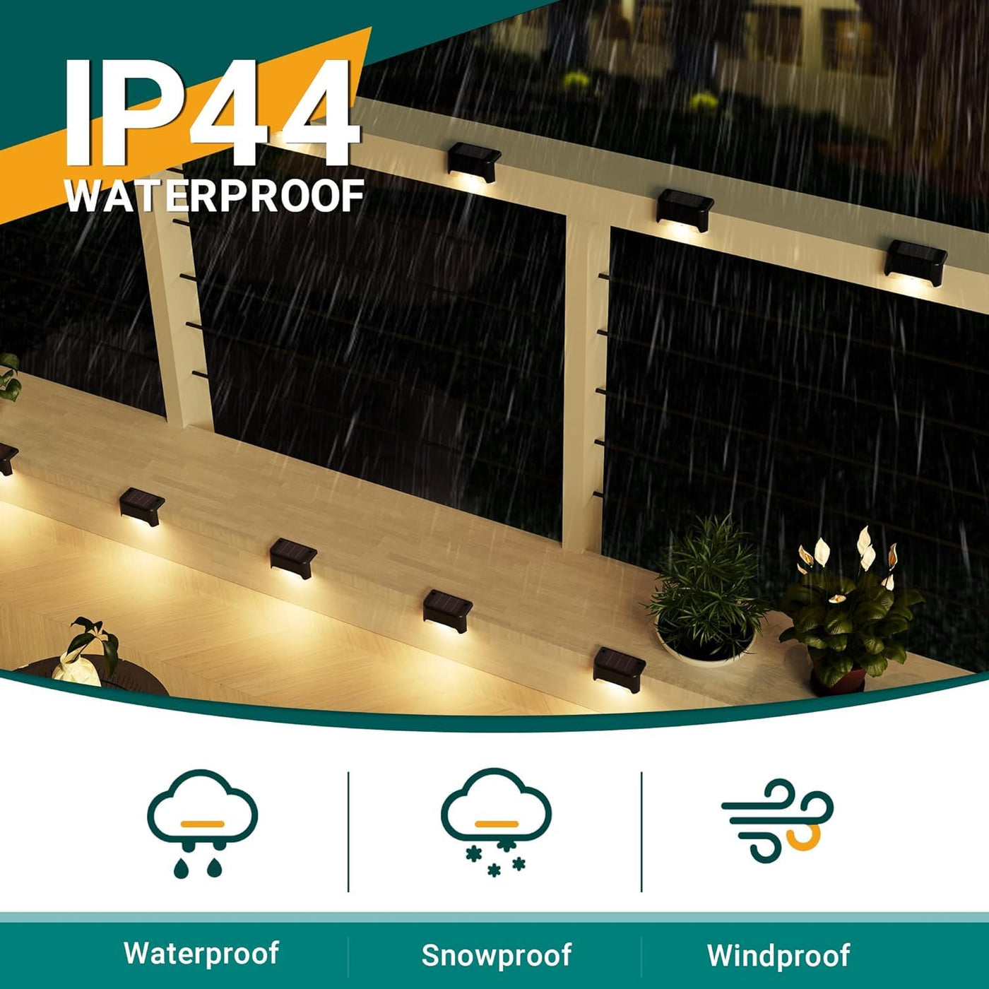[Weatherproof & Built to Last] Crafted with a premium ABS casing, BRITSPEAR solar stair lights are engineered to withstand the harshest weather conditions, be it scorching heat, heavy rain, or snow. With an IP65 waterproof rating, your outdoor lighting investment will endure for the long haul.